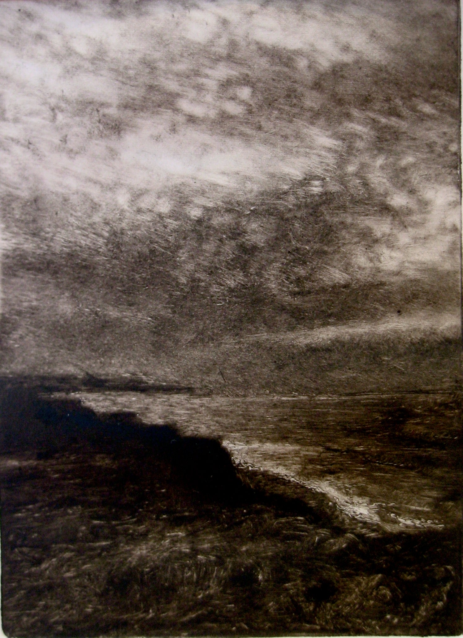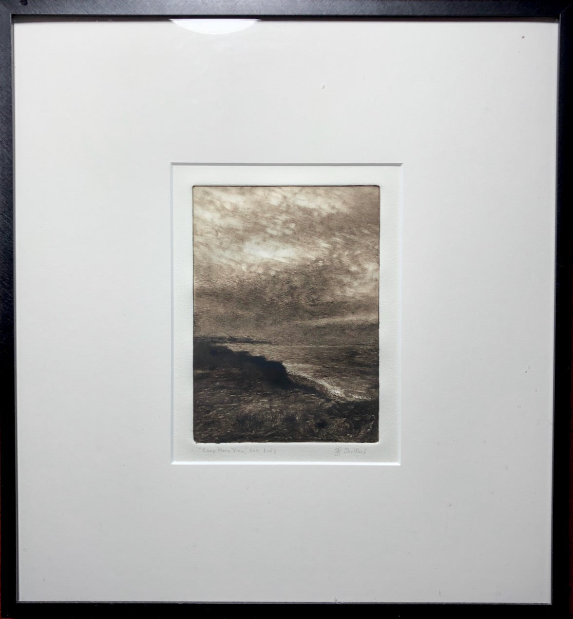 Monotype print on paper, framed in a black brushed metal frame and matted. The subject is a view of Atlantic Ocean seacoast of Montauk, New York from the vantage point of the cliffs over Camp Hero State Park.