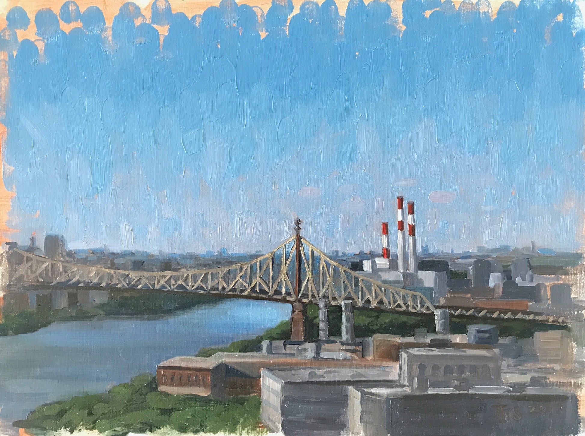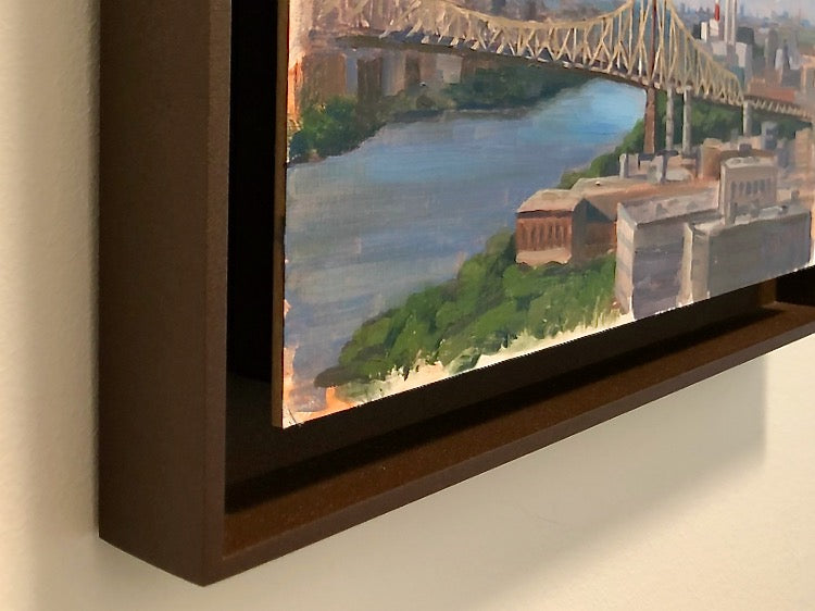 Landscape oil painting of the East River estuary in New York City, painted en plein air from an elevated view along the Long Island City waterfront. Framed and mounted in a rust-colored metal floater frame.