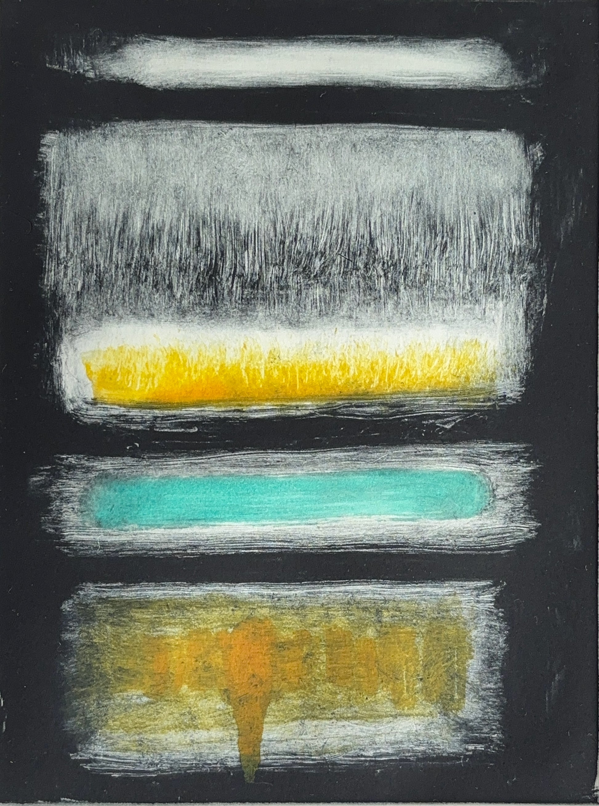 Monotype print on paper. An impression of the tropical ocean at sunrise, referencing the style of 1950s abstract expressionism.
