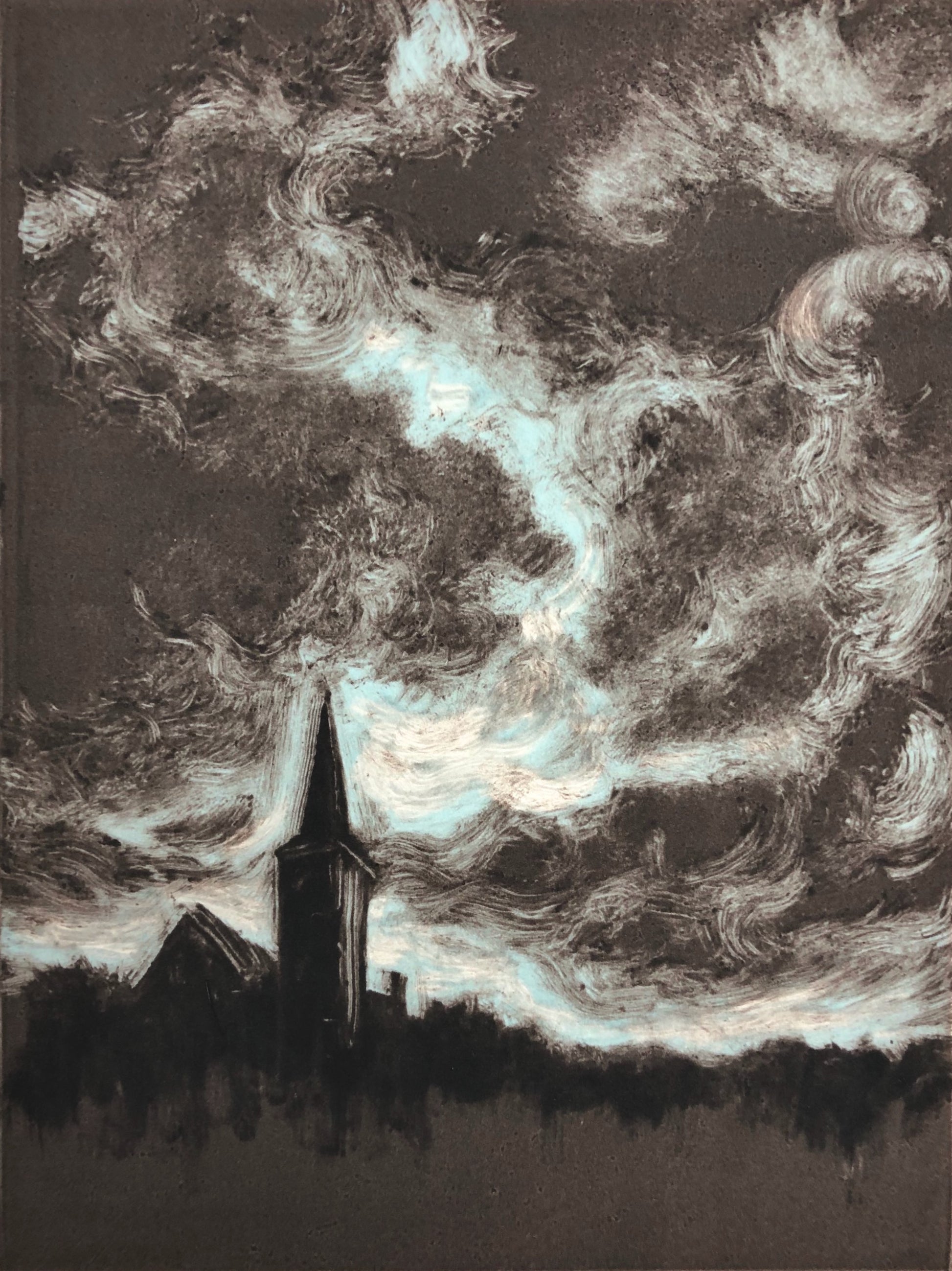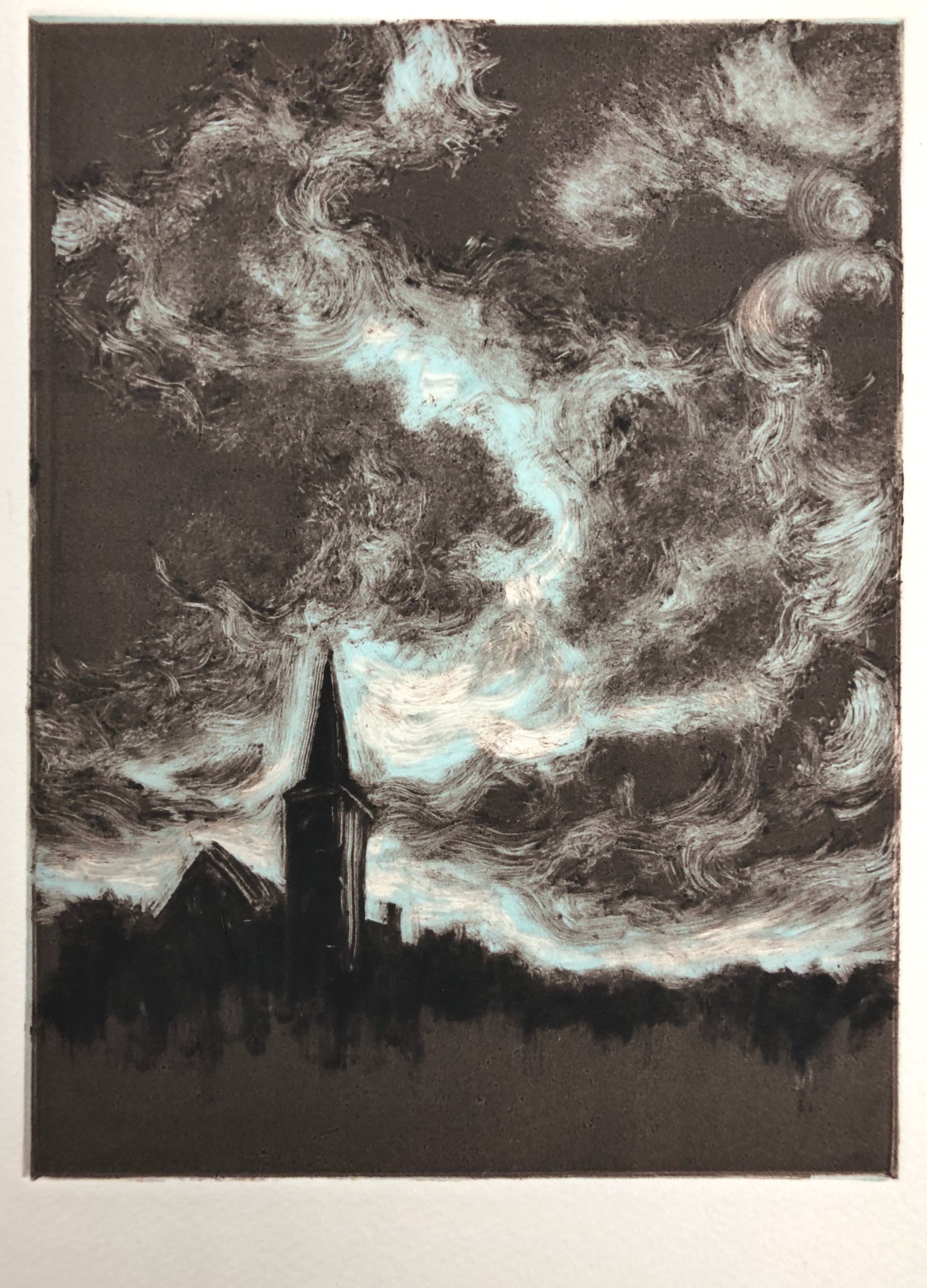 Monotype print on paper, unframed. The subject is a view of the Church of the Assumption in Westport CT on the Saugatuck River.